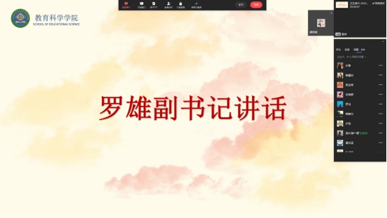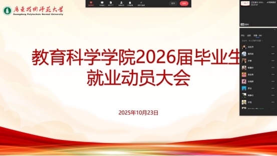 为帮助 2026 届毕业生认清就业形势、明确就业准备方向、充分用好学校就业服务资源,10月23日教育科学学院在线上组织召开 2026 届毕业生就业动员大会。教育科学学院党委副书记罗雄,毕业生辅导员袁炜老师,梁爽老师出席会议。2026 届全体毕业生参会。会议围绕就业关键信息解读与就业心态引导两大核心内容展开,为毕业生开启就业准备工作奠定基础。