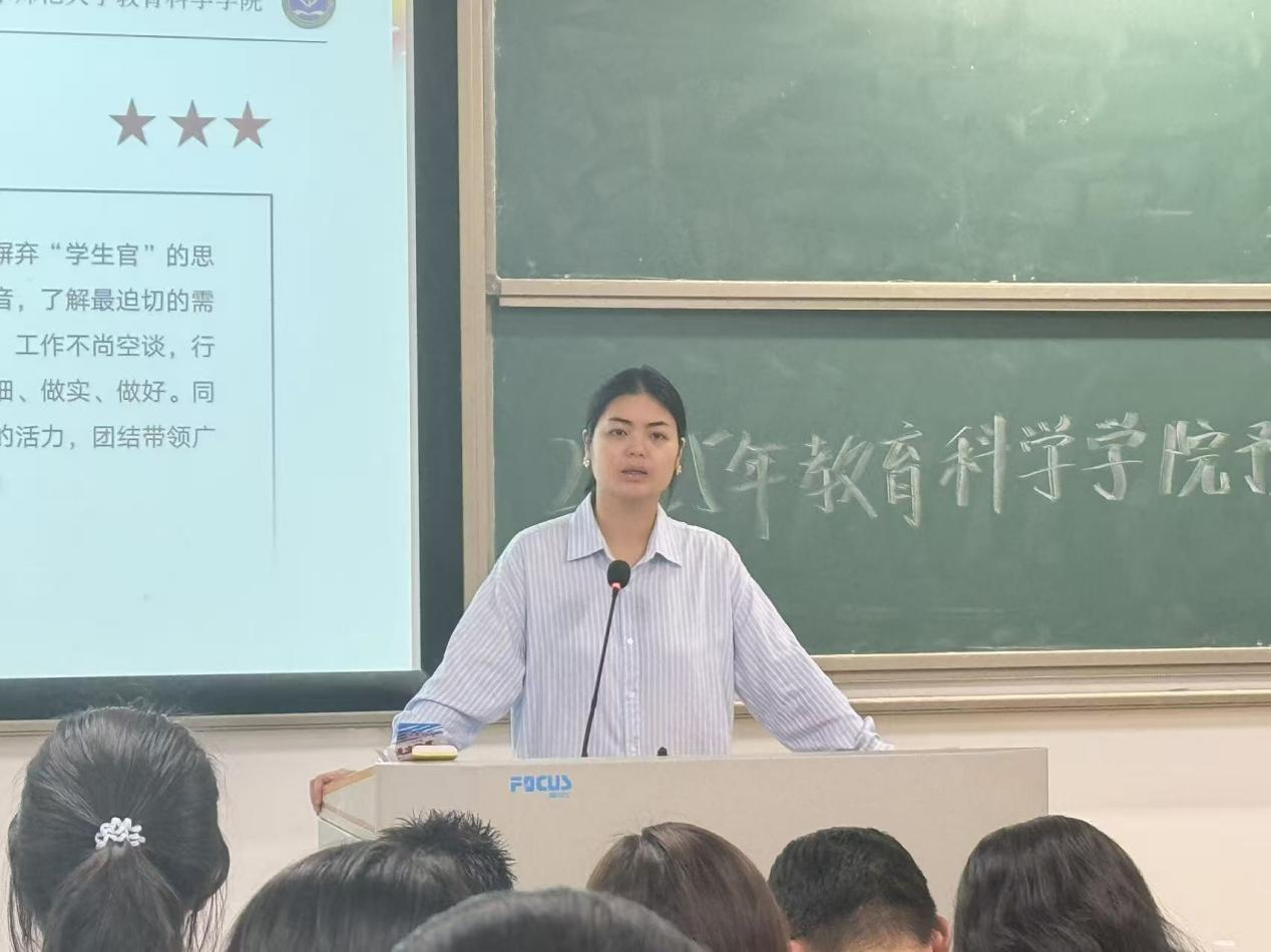 为端正学生干部的工作态度,提升其工作质量,严守其工作标准,我院于10月30日中午12点在河源校区唯实楼317教室召开了预干培训会议。教育科学学院党委副书记罗雄,教育科学学院辅导员杜翔宇、李一鸣,以及25级所有预干出席本次会议。