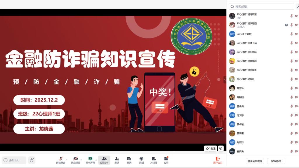 为进一步加强同学们的金融安全意识,筑牢校园反诈防线,我院勤工助学部于11月27日至12月5日组织各班开展“金融防诈骗知识宣传”主题班会。本次班会采用“线上+线下”的模式,23、24、25级学生线下集中参与,22级学生通过线上会议同步开展。