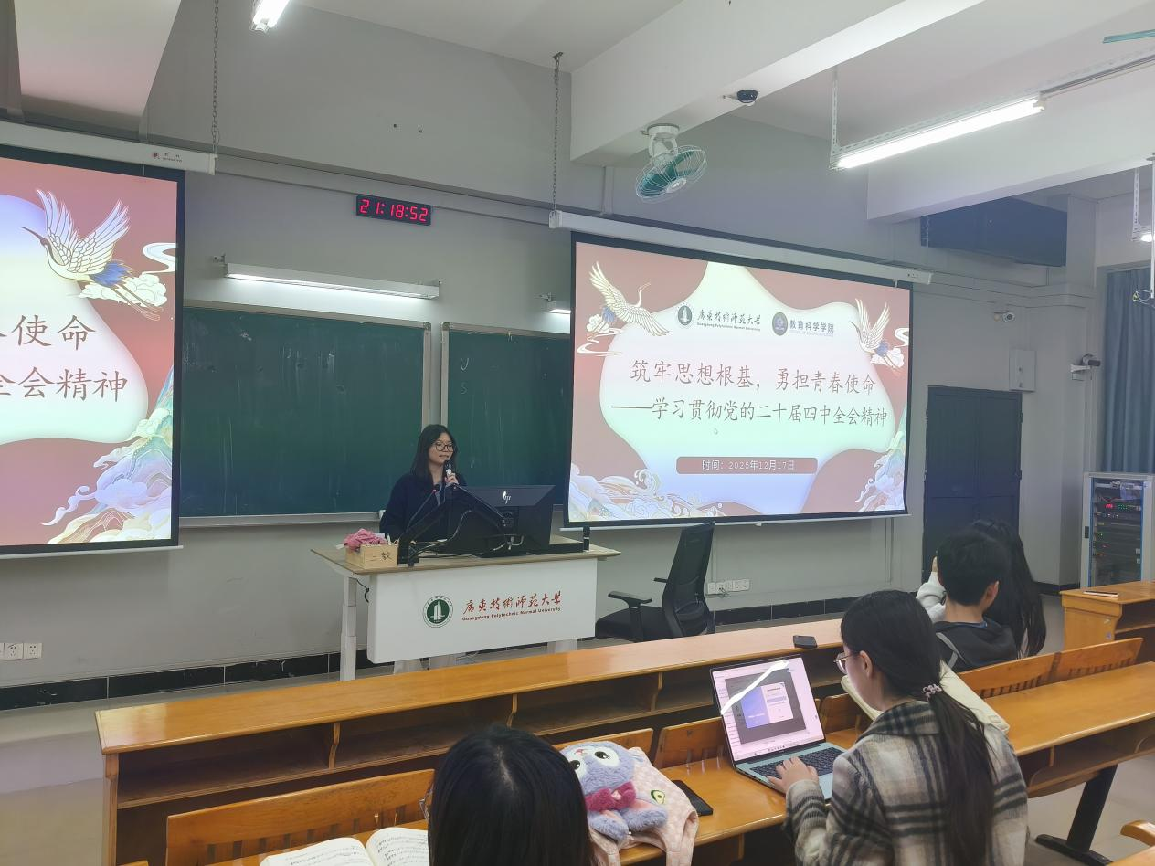 随后,会议聚焦党的二十届四中全会精神学习,朱芷馨同学带领团学干部们回顾全会的基本情况,详细解读全会审议通过的《中华人民共和国国民经济和社会发展第十五个五年规划纲要》,并鼓励大家勇担时代赋予青年的使命,自觉将个人理想融入国家发展大局,为实现第二个百年奋斗目标贡献自己的青春力量。