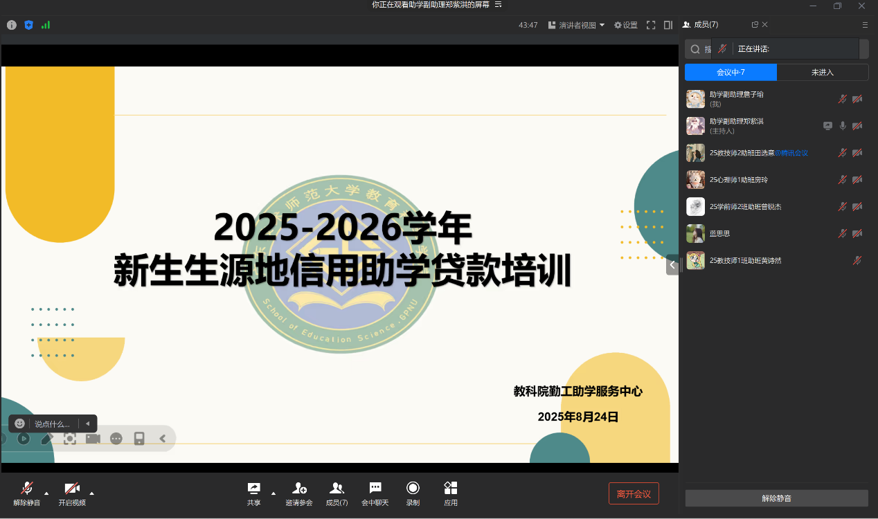 为扎实推进新生资助工作,帮助家庭经济困难新生明晰生源地助学贷款政策,我院勤工助学服务部于2025年8月24日晚以腾讯会议形式,召开了2024-2025学年新生生源地助学贷款专题宣讲会。