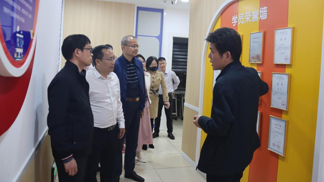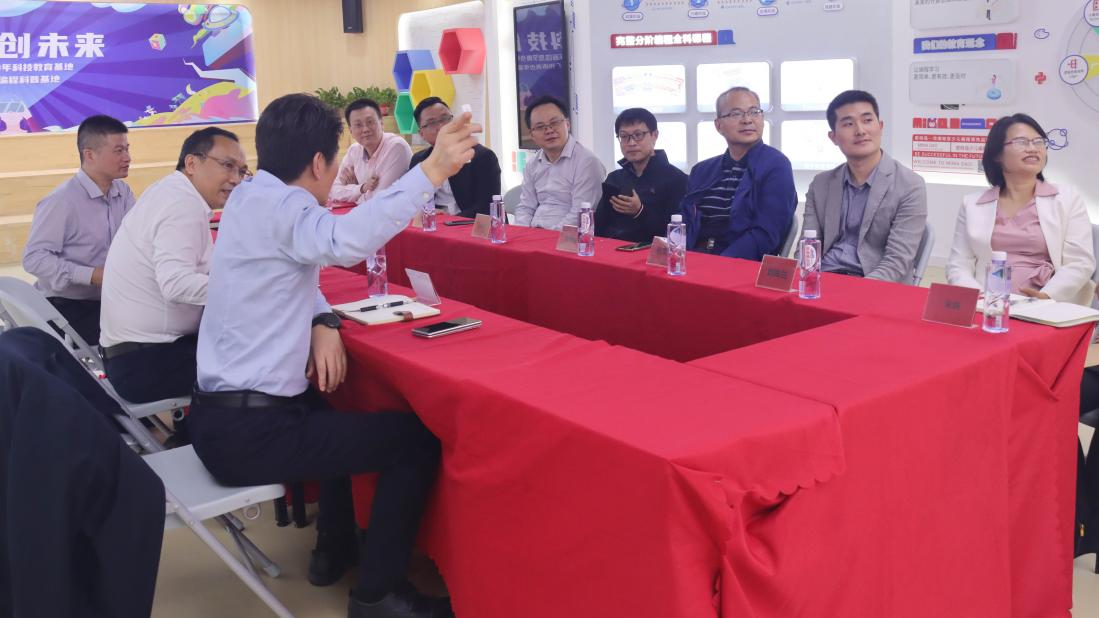 张旭日书记、熊华军院长一行首先参观并了解了广州密码营地信息科技有限公司的科普中心、学期社区和测评中心,对广州密码营地信息科技有限公司在广东省青少年客家教育基地、广州市科学技术普及基地、PAT青少年编程师资认证、中小学信息技术创客教育方向所积累的成果进行了充分的肯定。
