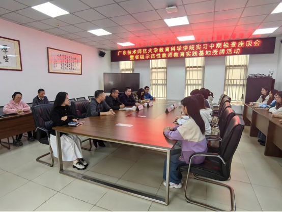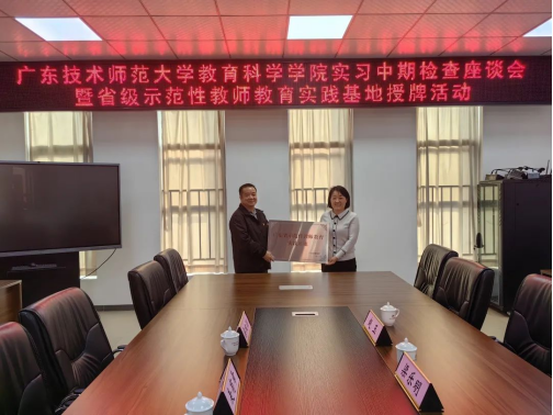 2023年11月14日,教育科学学院教育技术学系主任赵玉教授和专业负责人梁乐明博士赴佛山市顺德区龙江外国语学校开展实习中期检查座谈会暨省级示范性教师教育实践基地授牌活动。龙江外国语学校专职副书记麦有幸、科研处主任梁权潮、信息科组全体教师及实习生参与了此次活动。