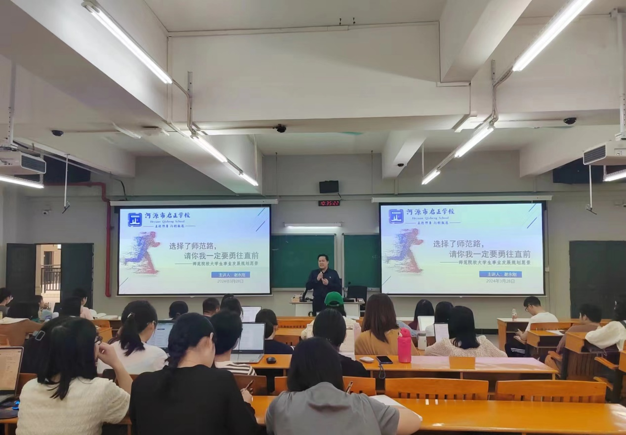 3月28日,河源市启正学校校长谢永刚受邀来我院做了一场《选择了师范路,请你我一定要勇往直前》的精彩讲座。讲座由熊华军院长主持,崔诣晨博士、付平博士和教科院白云校区100多名研究生参加了讲座。