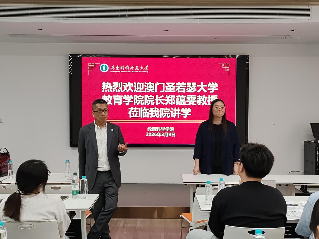 3月9日,为加强粤港澳大湾区高等教育交流合作,澳门圣若瑟大学教育学院院长郑蕴雯教授受邀来我院进行访问交流,在东校区工业中心803为我院师生作题为《人工智能驱动的数字学习变革:澳门高等教育的经验与反思》的学术讲座,并由该校招生处处长李志恒担任翻译。讲座由教育学院副院长谢德新教授主持。
