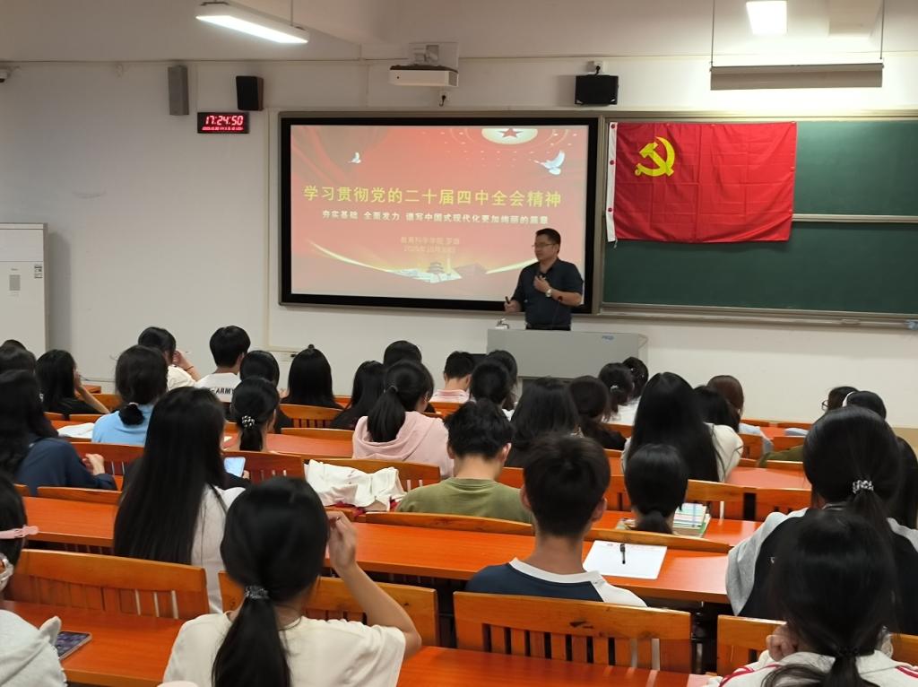 为深入学习贯彻党的二十届四中全会精神,2025年10月30日在河源校区唯实楼315,教育科学学院党委副书记罗雄面向学院辅导员、入党申请人员、学生干部主讲党的二十届四中全会精神专题学习会。