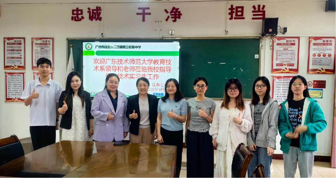 为深化教育技术学专业人才培养模式改革,切实提升师范生实践能力,全面掌握学生实习进展,2025年10月30日下午,我院教育技术系组织前往江高三中开展教育实习中期检查工作。系主任赵玉教授、校内指导教师王朋利博士、王孝金博士,江高三中陈尚峰主任、实习指导教师叶小莹及六名教育技术系实习生参会。