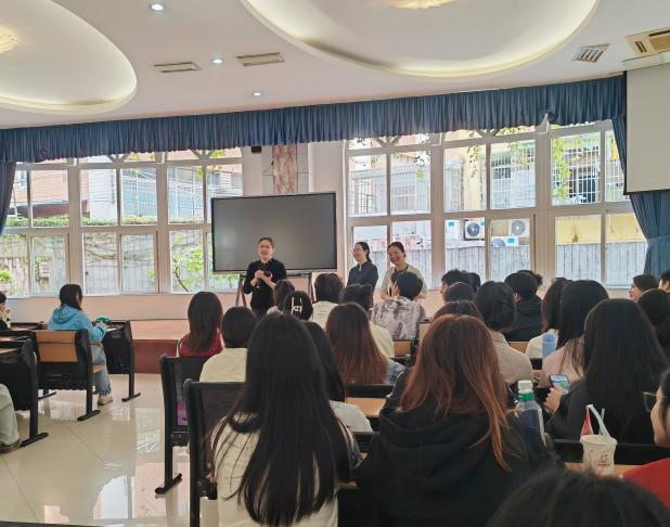 在园方的精心安排下,师生们依次观摩了幼儿园的园所环境、户外游戏和活动室。幼儿在区域活动中展现的创造力、高质量的师幼互动以及“教育无痕”的环境创设理念等,给师生们留下深刻印象。随后,广州市东方红幼儿园林举卿园长和沈文娜副园长结合具体案例,生动阐释了幼儿园的办园理念、环境创设、课程建设并详细的向学生讲解了人才需求的标准。