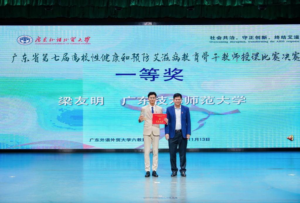 2025年11月13日,广东省第七届高校性健康和预防艾滋病教育骨干教师授课比赛决赛在广东外语外贸大学落下帷幕。教育科学学院教育技术系青年教师梁友明博士荣获一等奖,广东技术师范大学获得优秀组织奖。教育科学学院谢德新副院长莅临现场,学前教育系及教育技术系的部分同学现场观摩比赛。
