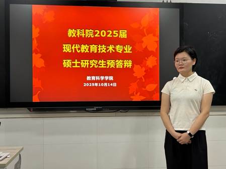 2025年10月14日上午,教育科学学院2025届下半年现代教育技术专业硕士研究生学位论文预答辩在白云校区第二实训楼503顺利举行。本次预答辩特别关注学位论文的质量与细节,学院为此成立了专门的预答辩工作小组,并邀请了相关领域的专家进行评审。
