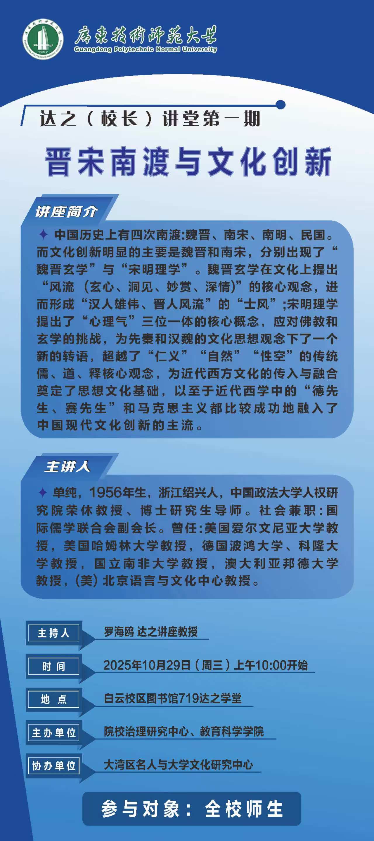 【10.29讲座预告】晋宋南渡与文化创新